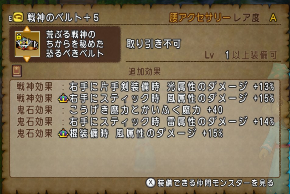 | 戦神のベルト | ベルト | 棍装備時風/魔力 | 攻撃魔力と回復魔力 どちらも反映されて アツい! |