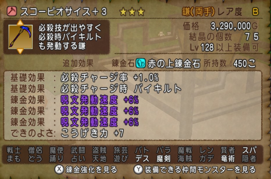 | スコーピオサイス | ・必殺チャージ率+1% ・必殺チャージ時バイキ | 必殺最強!スパ必殺最強! たぶんこちらのが強い気はする。入手性はどうなんだろう |