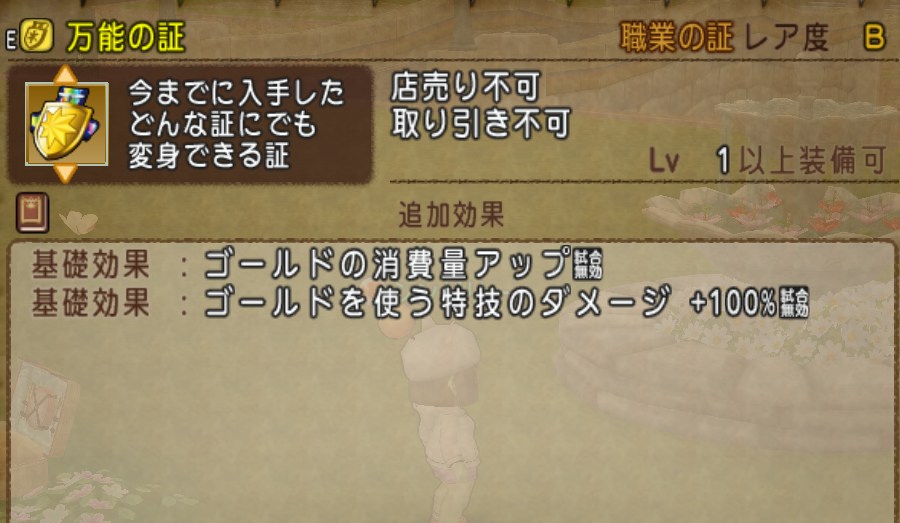 スパスタの証の効果は「ゴールドを使う技の消費Gが2倍になる代わりに性能が上がる」というもの。